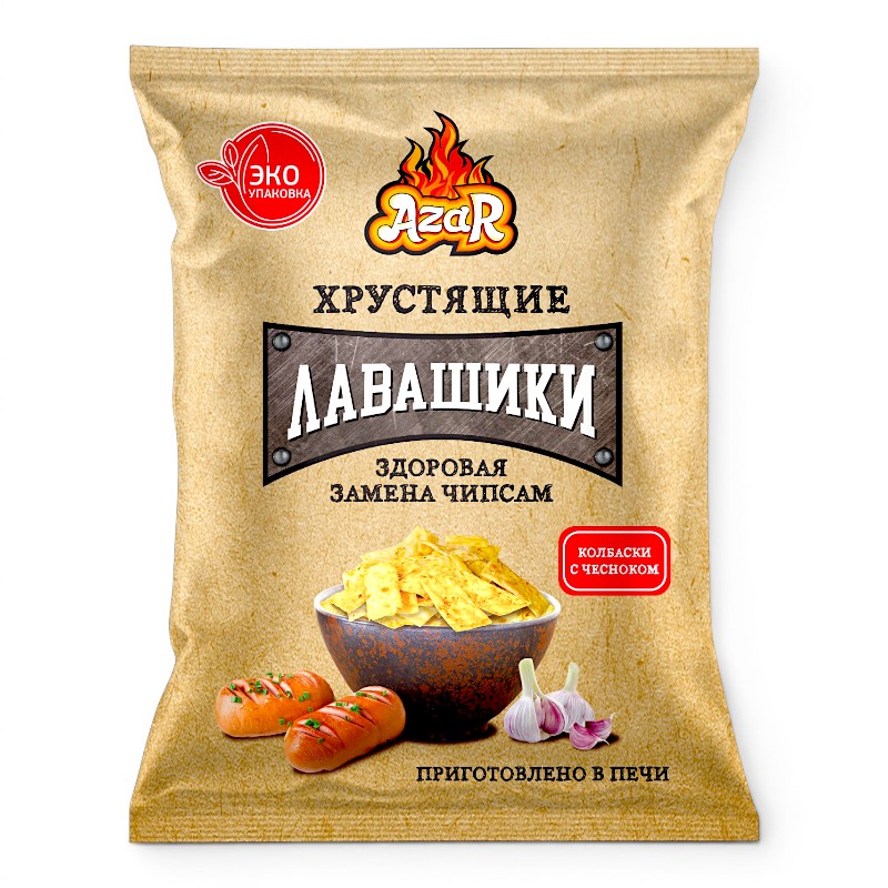 описание : Хрустящие лавашики со вкусом и ароматом "Колбаски с чесноком" ТМ "AZAR" пакет 100 гр (1*14)