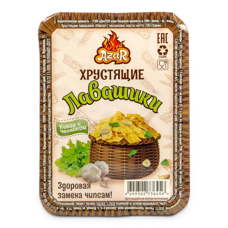 | описание : | Хрустящие лавашики со вкусом и ароматом "Кинза с чесноком" TM "AZAR" контейнер 100г (1*16) |