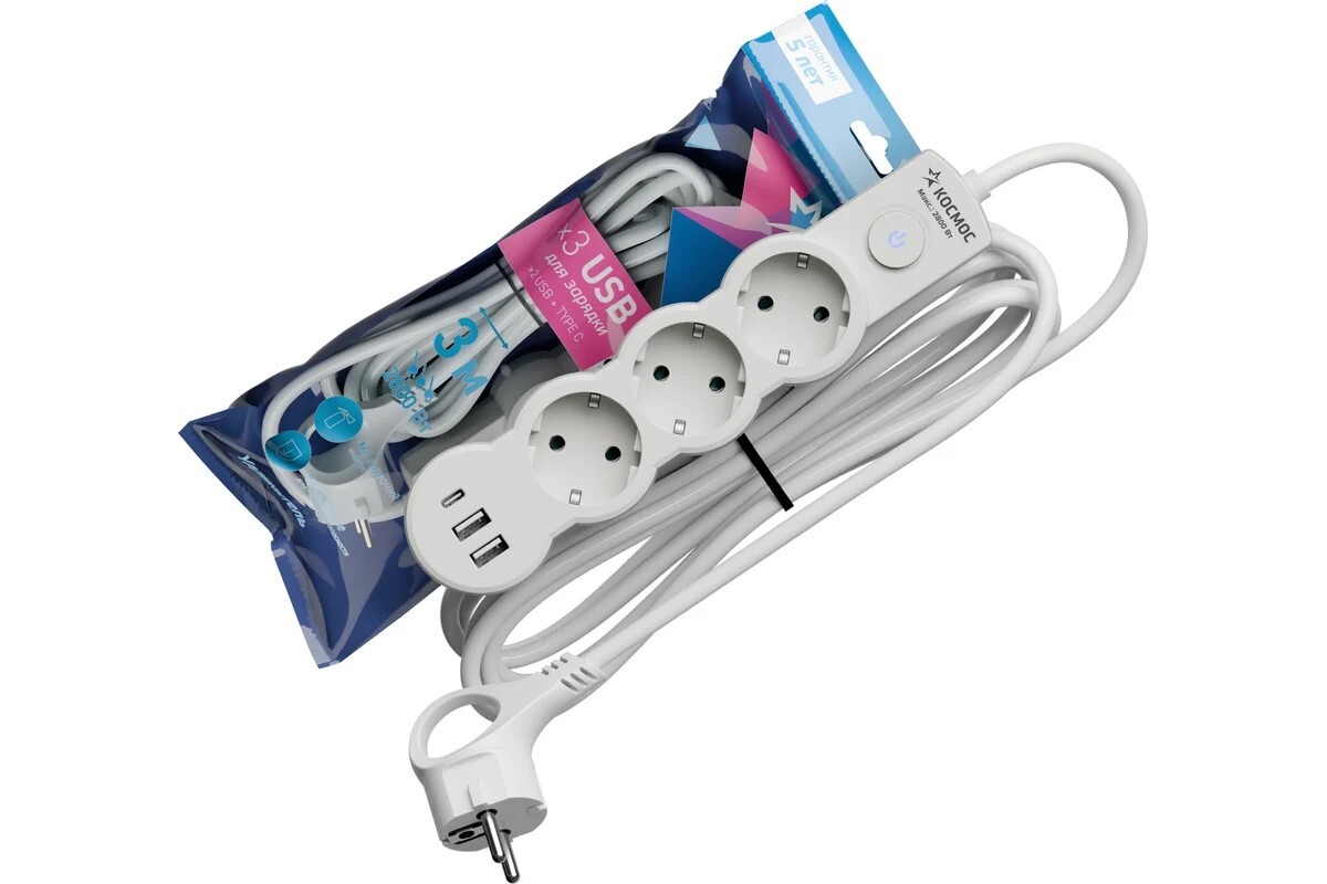 Сетевой фильтр, удлинитель Космос  YKsm3m3g-Z-VU10A-W 3 розетки 3 метра, USB, белый, заземление, выключатель, 10А, 220 вольт, ПВС 3х1, IP20 - купить в компании MAKtorg Артикул: 1510046