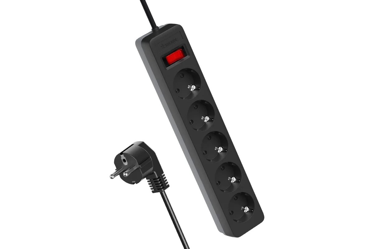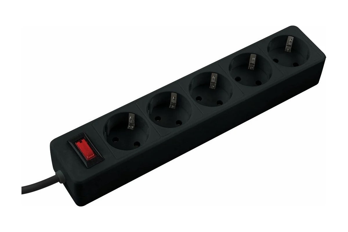 сетевой фильтр, 5 розеток 1.8 метра, черный, заземление, выключатель, 10А, 220 вольт, ПВС 3х3х0,75, IP20