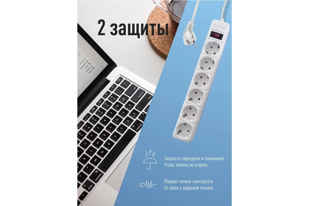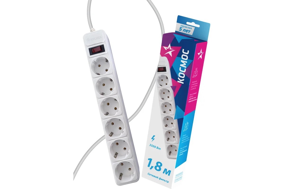 сетевой фильтр, 6 розеток 1.8 метра, белый, заземление, выключатель, 16А, 220 вольт, ПВС 3х1, IP20