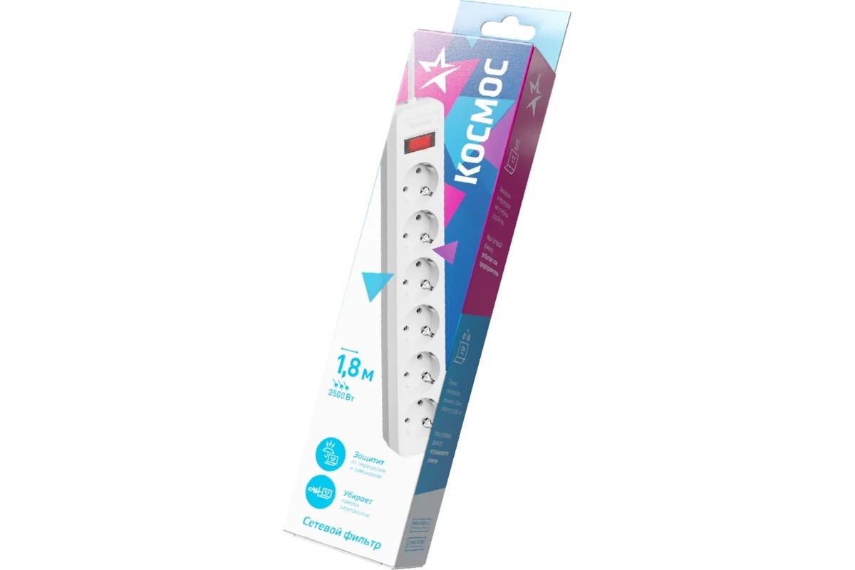 | описание : | сетевой фильтр, 6 розеток 1.8 метра, белый, заземление, выключатель, 16А, 220 вольт, ПВС 3х1, IP20 |