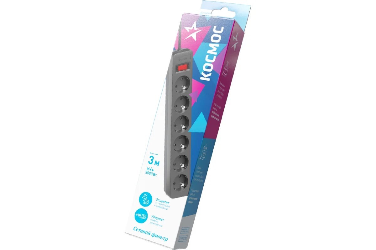Сетевой фильтр, удлинитель Космос  FKsm3m-6g(B)16A сетевой фильтр, 6 розеток 3 метра, черный, заземление, выключатель, 16А, 220 вольт, ПВС 3х1, IP20 - купить в компании MAKtorg Артикул: 1510056