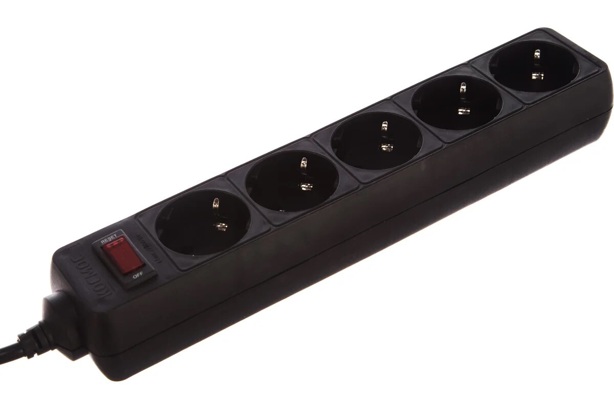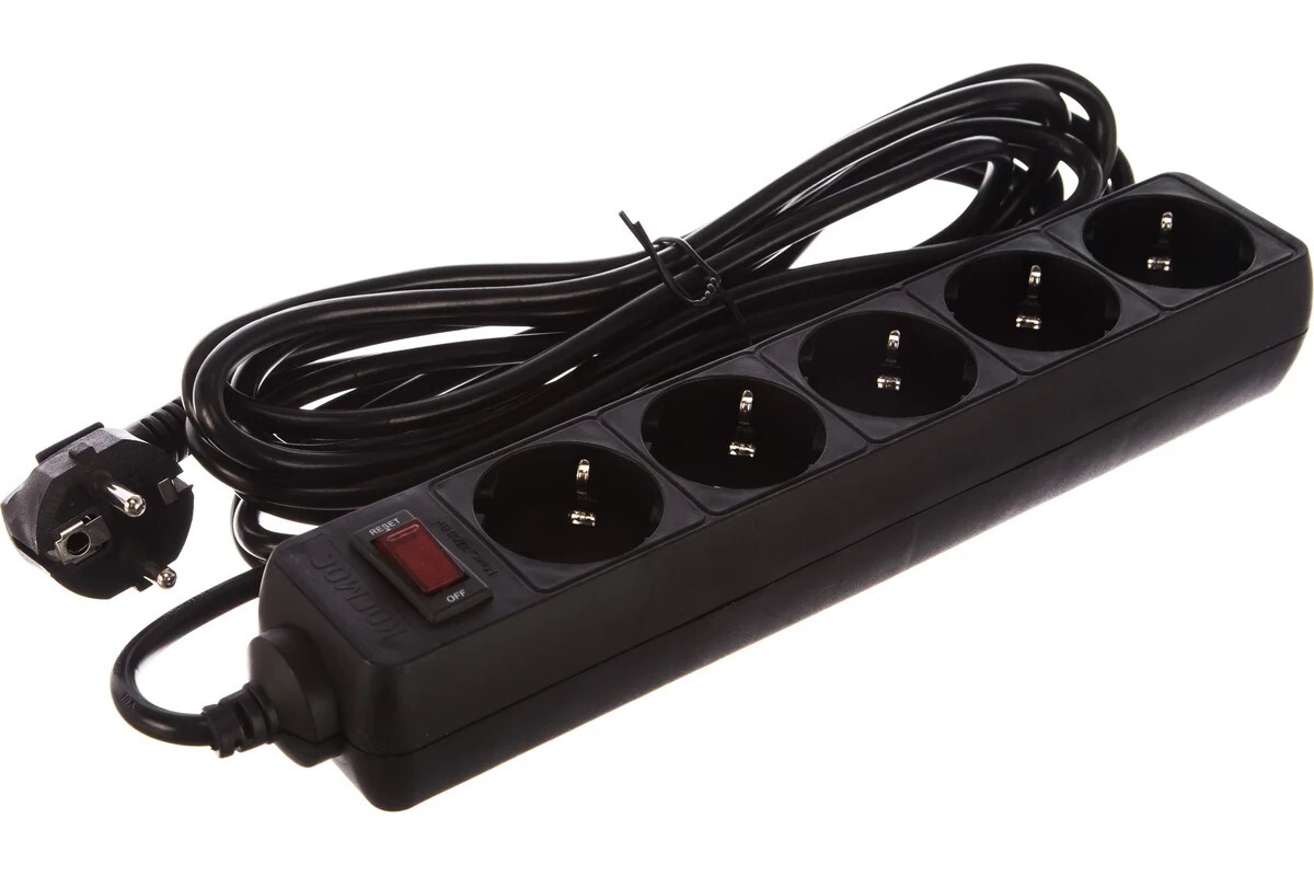 сетевой фильтр, 5 розеток 5 метров, черный, заземление, выключатель, 10А, 220 вольт, ПВС 3х0,75, IP20