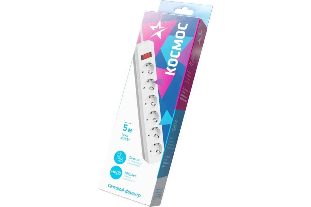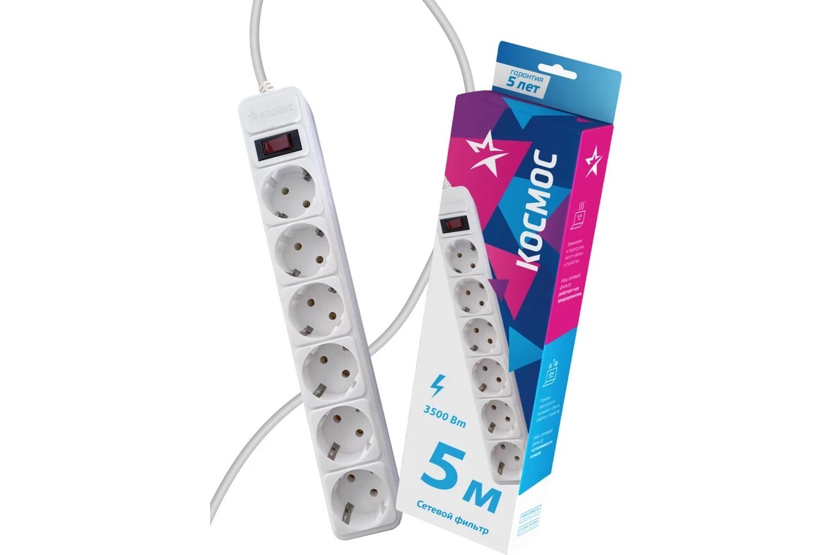 | описание : | сетевой фильтр, 6 розеток 5 метров, белый, заземление, выключатель, 16А, 220 вольт, ПВС 3х1, IP20 |