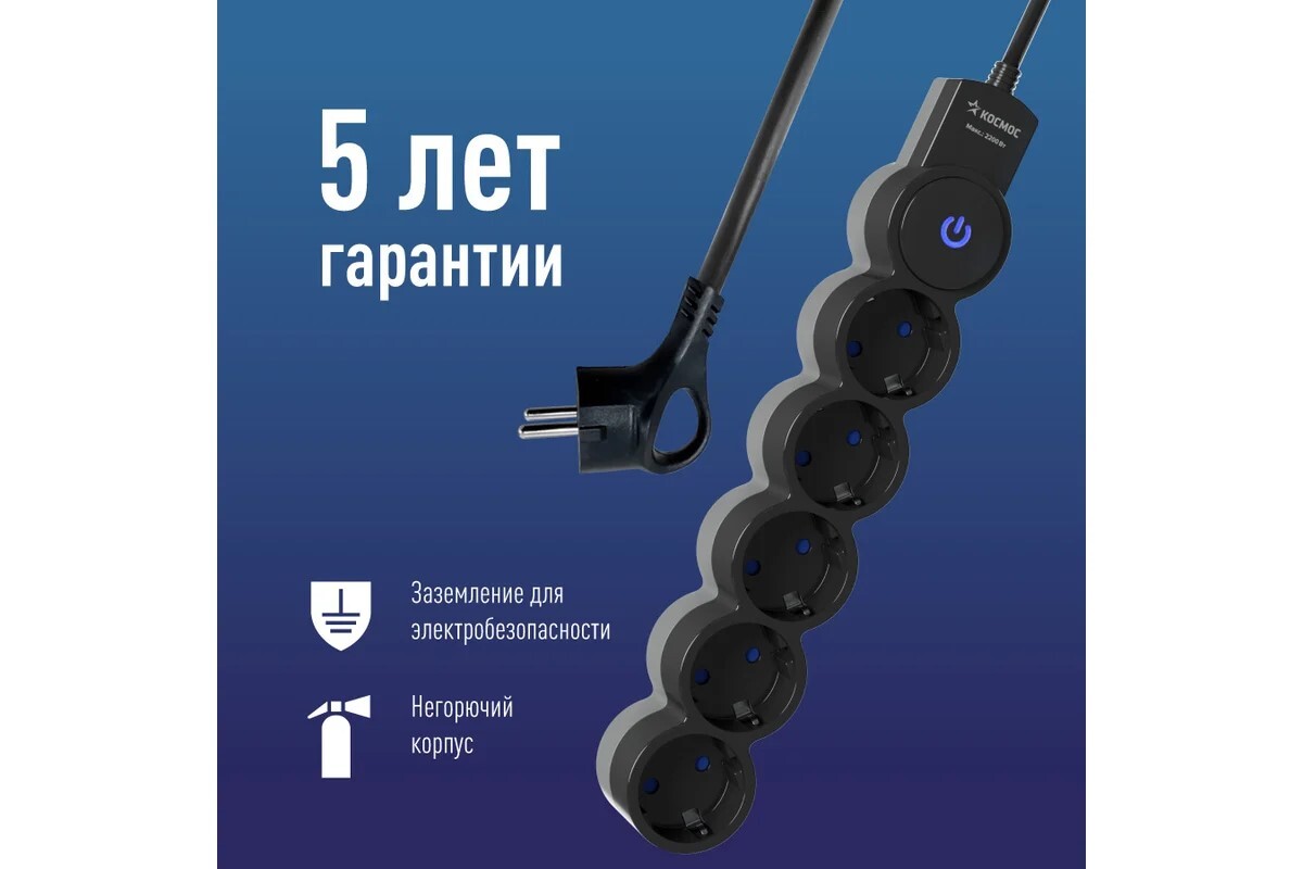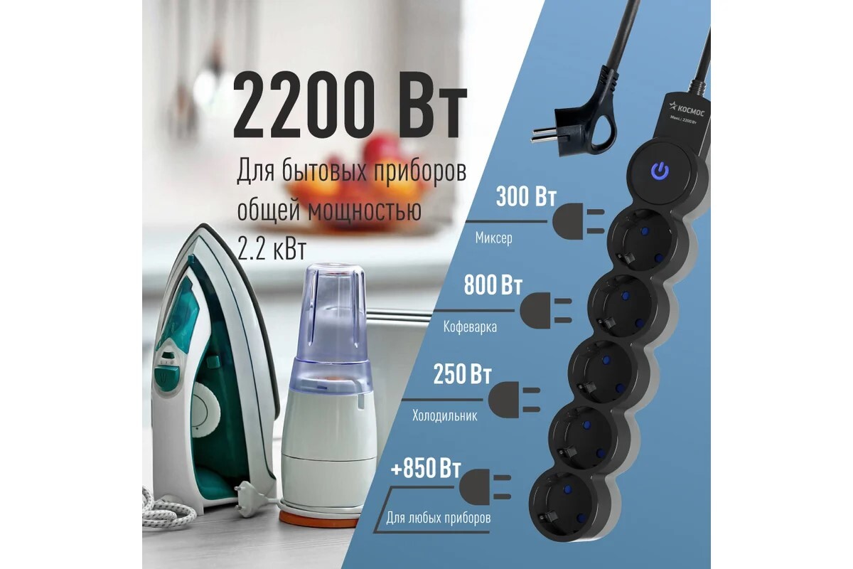3 розетки 1.5 метра, черный, заземление, выключатель, 10А, 220 вольт, ПВС 3х1, IP20