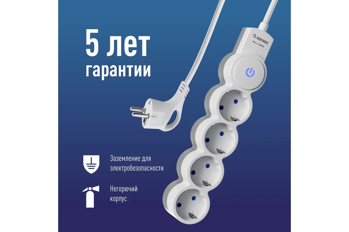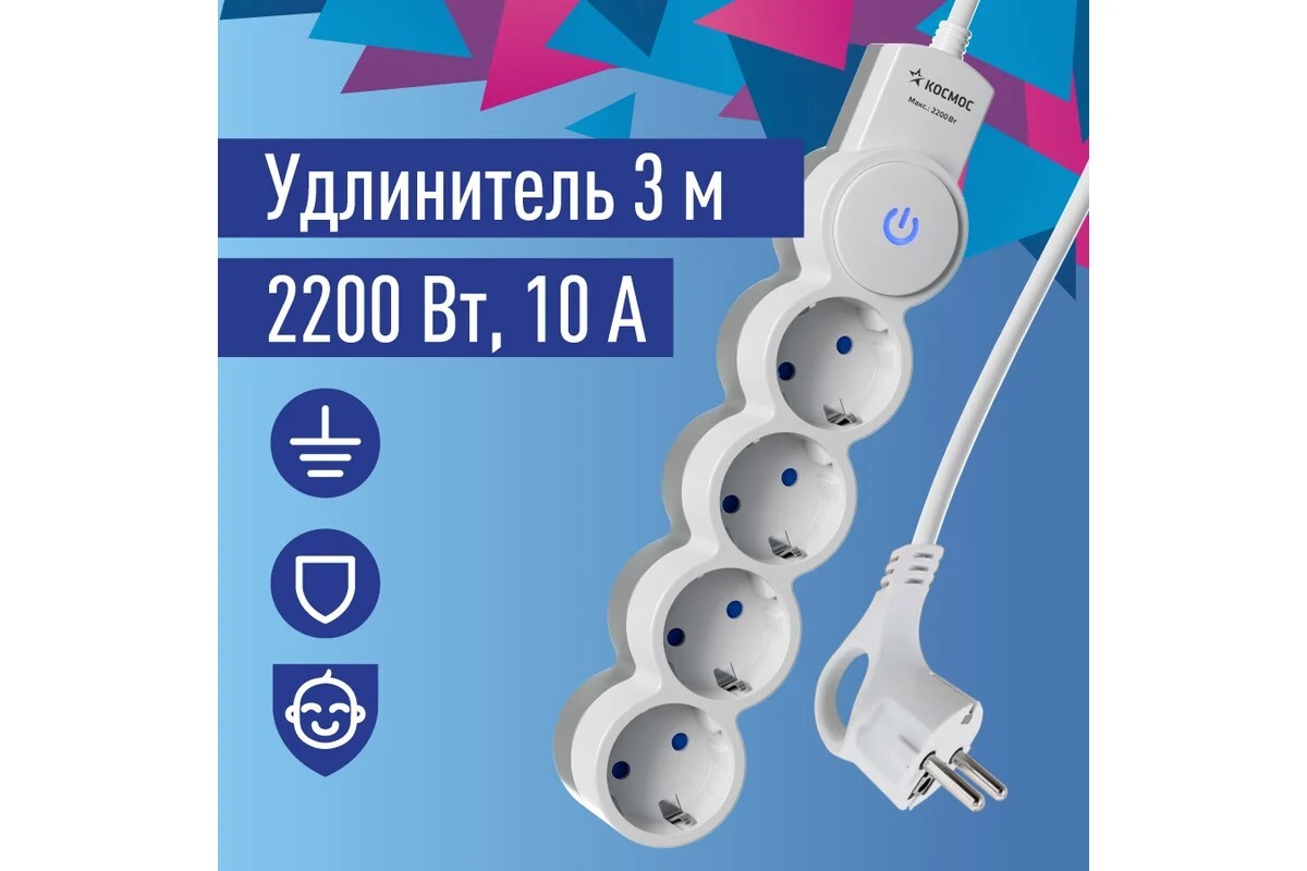 описание : | 4 розетки 3 метра, белый, заземление, выключатель, 10А, 220 вольт, ПВС 3х1, IP20 |