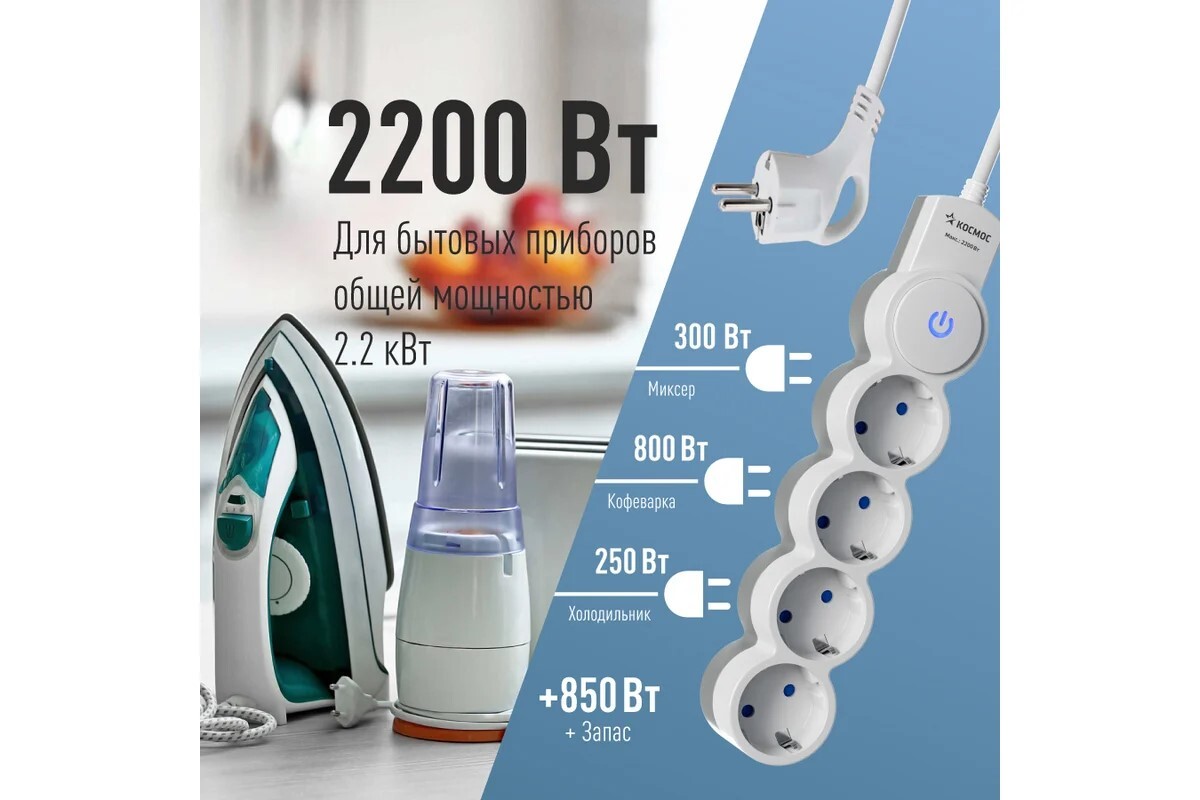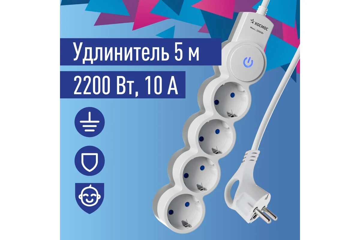 Сетевой фильтр, удлинитель Космос Удлинитель YKsm5m-4g-Z-V10A-W 4 розетки 5 метров, белый, заземление, выключатель, 10А, 220 вольт, ПВС 3х1, IP20 - купить в компании MAKtorg Артикул: 1510028