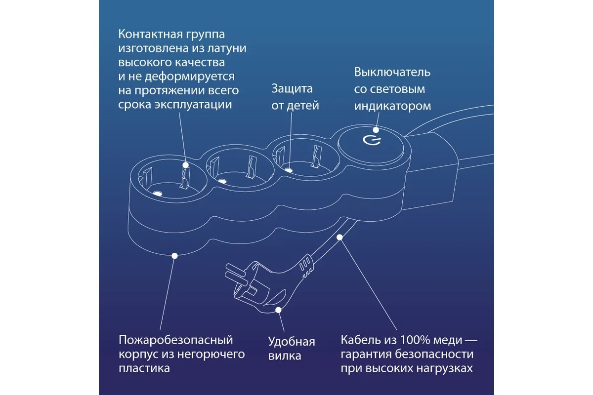 описание : 4 розетки 5 метров, белый, заземление, выключатель, 10А, 220 вольт, ПВС 3х1, IP20