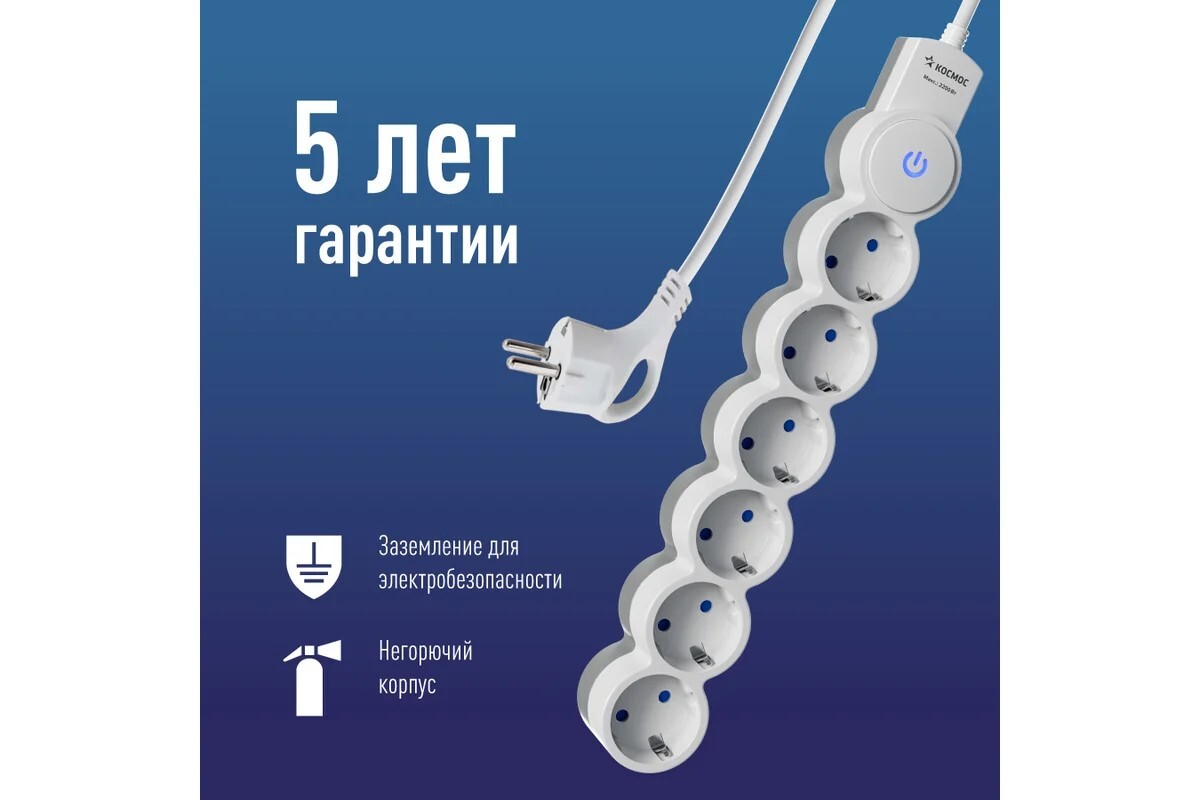 Сетевой фильтр, удлинитель Космос Удлинитель YKsm5m-6g-Z-V10A-W 6 розеток 5 метров, белый, заземление, выключатель, 10А, 220 вольт, ПВС 3х1, IP20 - купить в компании MAKtorg Артикул: 1510031