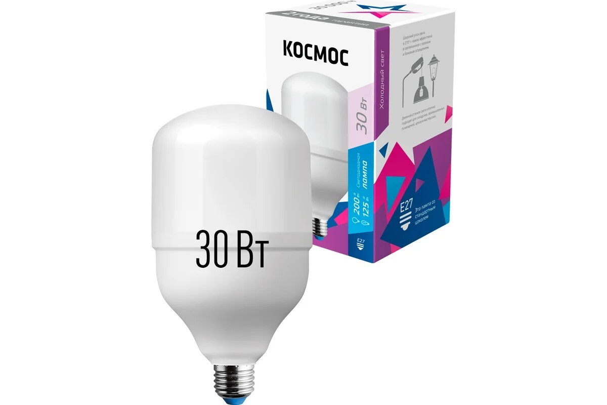 цоколь E27, цилиндр HW, 30Вт=200Вт, холодный 6500k, световой поток 2850лм, 220 вольт