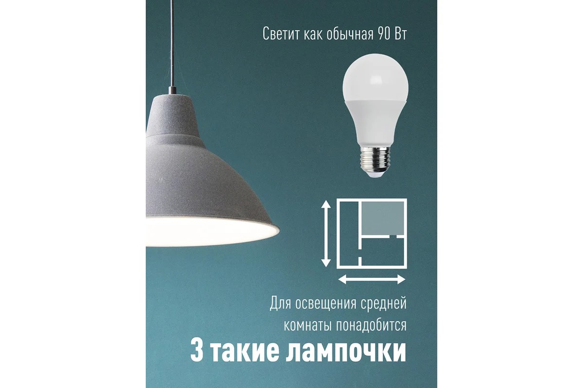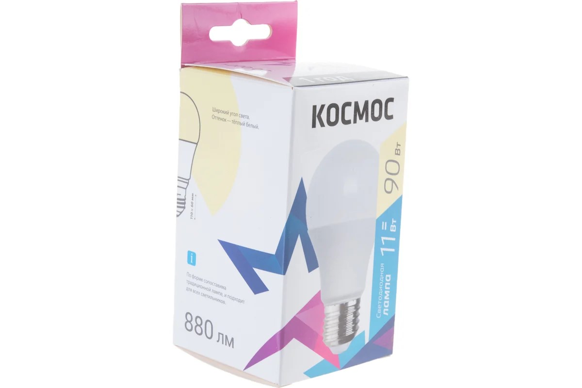 цоколь E27, груша А60, 11Вт = 90Вт, теплый 3000k, световой поток 880лм, 220 вольт