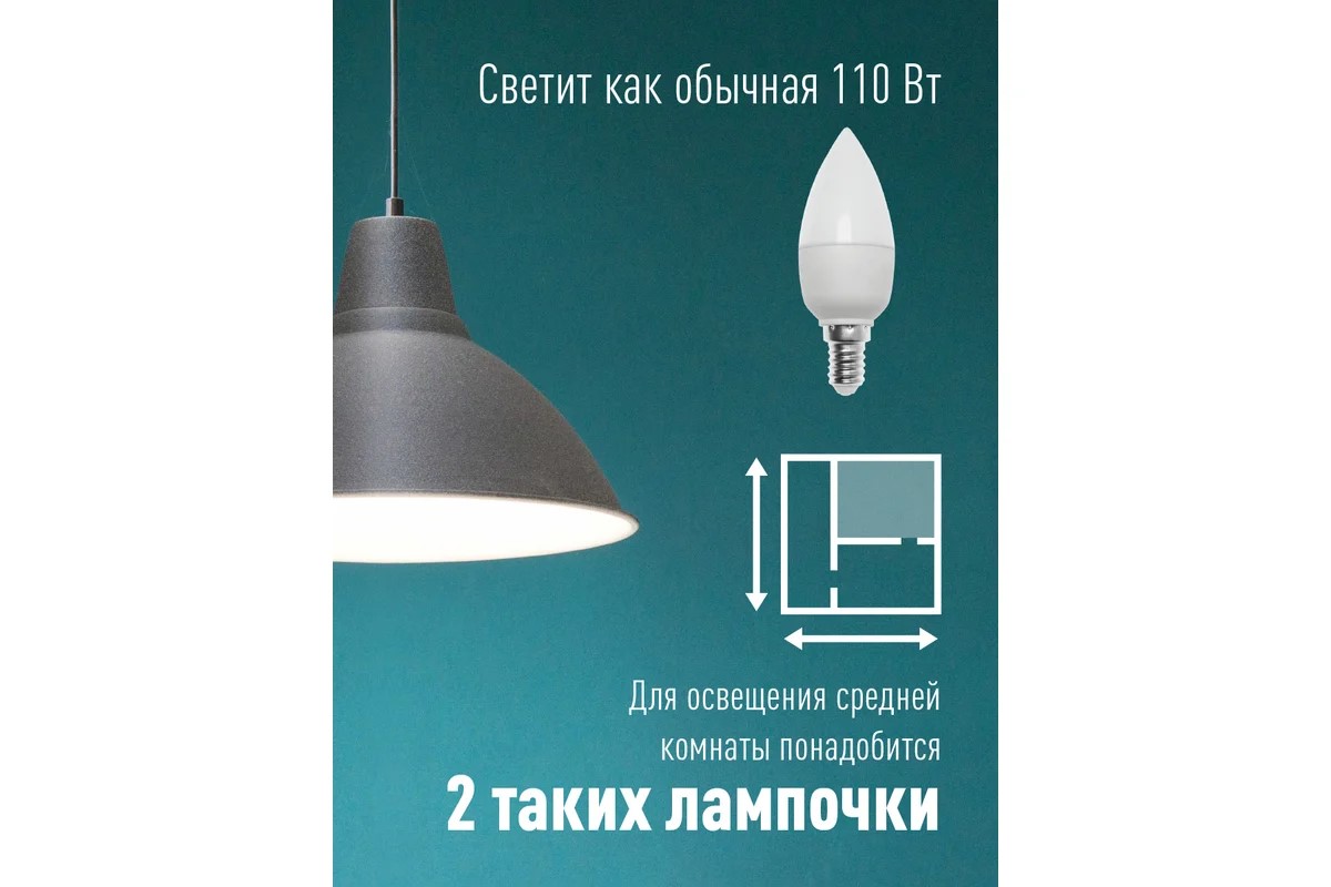 цоколь E14, свеча CN, 12Вт = 110Вт, теплый 3000K, световой поток 1070лм, 220 вольт