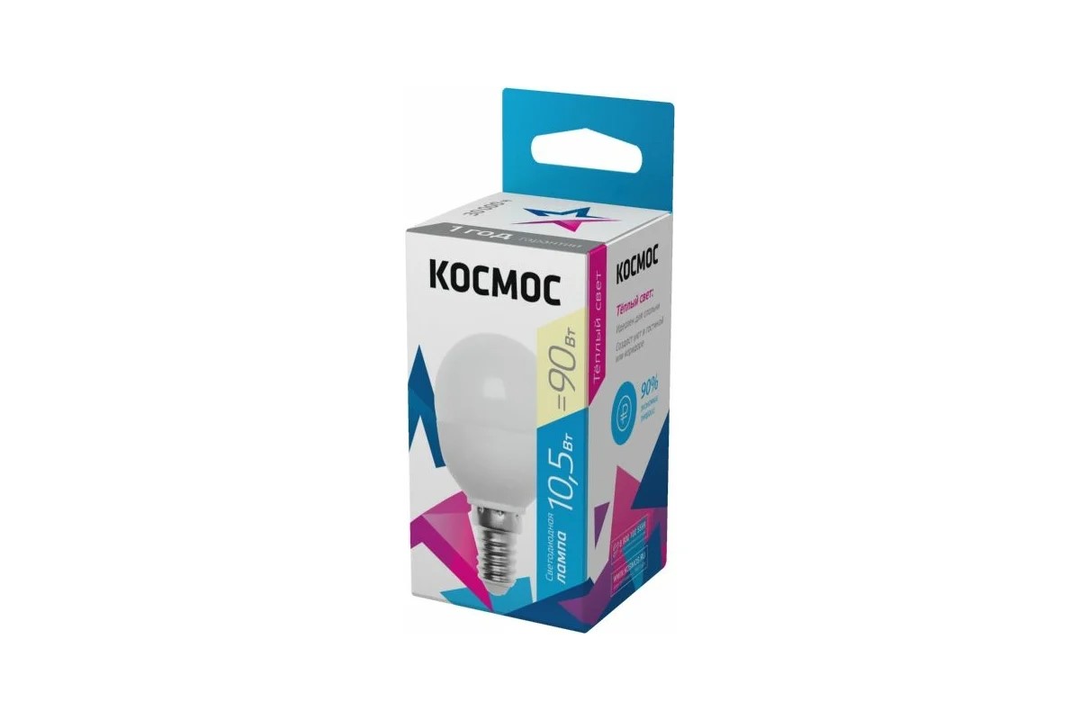 цоколь E14, шар GL45, 10.5Вт = 90Вт, теплый 3000K, световой поток 840лм, 220 вольт
