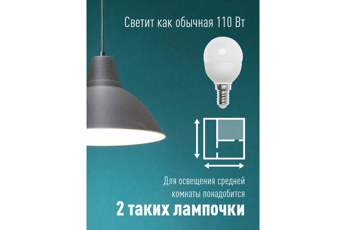 цоколь E14, шар GL45, 12Вт = 110Вт, теплый 3000K, световой поток 1070лм, 220 вольт